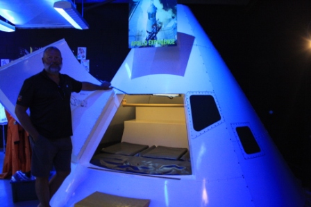 At the entrance to the museum is a replica Apollo capsule simulator which you climb into (astronaut overalls optional) and be closed in, lying in launch position, as a 7 minute video experience takes you through a launch. The capsule is cramped and although there is no actual movement its quite unnerving as the video and soundtrack take you through the launch sequence. With speakers next to your ears and small screens to the side of you acting like windows you hear the NASA chatter, see the lift-off, see the flames out of your side windows and take the ride into space until finally seeing our big blue planet from above. A fantastic experience but I was glad to get out of there too.