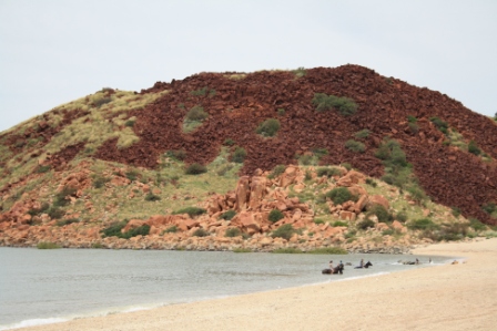 Arriving at Point Samson and Samson Beach we moved in to the little 20 site beach caravan park and again could choose wherever we wanted to park in. In fact for the size of our van and to enable us to leave the car and caravan hitched together we were told ‘take two sites, no-one else is here”. Perfect. We parked ourselves under a huge shady tree, with the temperature predicted to be 40 degrees, and headed to the beach to escape the oppressive heat. Huge ships were on the horizon as they seem to be everywhere in this region, lining up to come in and be filled with iron ore and return to China.