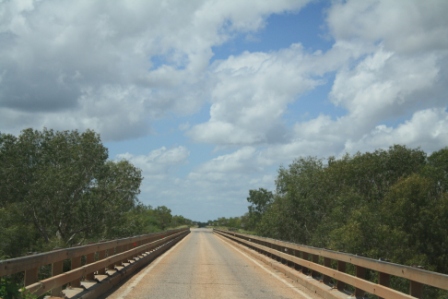 We’ve crossed a few bridges over wide brown river beds, some with a little bit of water in them but the massive width of the river beds gives you an idea of how raging the rivers must get up here in the wet. We saw something we’ve not seen anywhere else before and that was the highway being reduced to a one lane road to cross over the bridges, prepare to give way if something is coming the other way. This is still road train territory too.