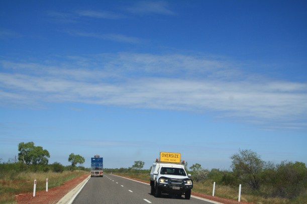 As we drove further south the next day the weather was feeling drier with much less humidity than we had been experiencing and the sky was looking bluer by the kilometre. The day was like any other, road trains, roadside cows, the odd roo hopping across the road and a ‘get off the road – wide load coming through’ moment. And when they take up more than half the highway, you get out of their way!