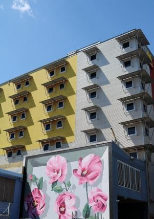 Adding some brilliant colour to a long wall is this abstract style piece which was painted by Phibs. Using a colour palette as seen in Darwin sunsets the artist was inspired by the diverse flora and fauna of the Northern Territory.
