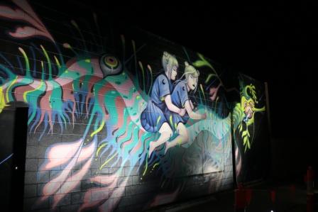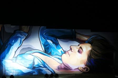 Amongst the illuminated street art were murals by Elle, Smug, Lisa King, Vans the Omega and more. There was an interesting projection which involved being something of a voyeur and standing on the outside looking in through a louvered window.