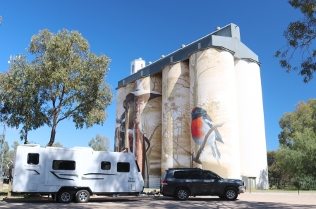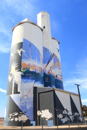 One set of silos features a Regent Parrot on one side and a yabby (freshwater crayfish) on the other which was painted by Melbourne based artist Jimmy DVate. The other silos feature the Southern Bell Frog, Murray Hardyhead fish and the Freckled Duck, river red gums and pelicans which were created by local artist Garry Duncan.