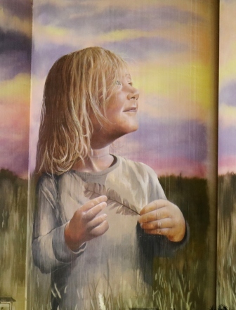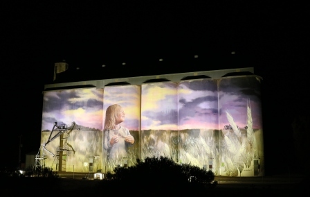 A beautiful colourful sunset glows over wheat fields in which a little girl stands, these silos were painted by Melbourne artist Cam Scale. I think this one looks even more spectacular at night.