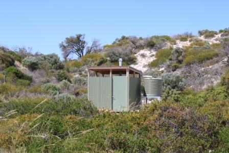 Turn left and you arrive at a sheltered area behind sand dunes where you can choose a site and set up. This area also has a long drop toilet and drive on access to the beach.