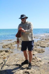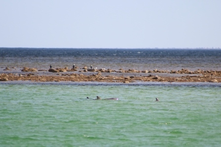 Just past this sandy beach is a rocky reef which is exposed in low tide and is also easy to walk on. This is a top fishing spot with the water deep at the side and end of the reef and big squid and whiting there for the taking, that is if you can beat the dolphins and one seal that we saw.