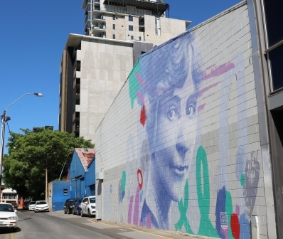 This mural of Muriel Matters was painted as part of the Adelaide Fringe Festival in January 2018.