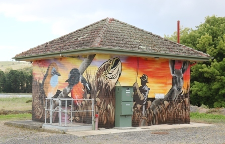 The painting features two of the local endangered bird species, the Southern Emu Wren and Scarlet Robin, as well as kangaroos, the old butter factory and a kayaker and fisherman, which represent the new public access to this reservoir area for recreational activities.