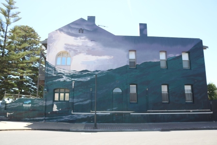 In Glenelg you can find on the side of the Seawall Apartments building a mural called ‘Beastly Sea’ which was painted by Dave Court, based on a photo by Che Chorley.