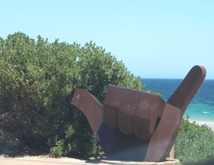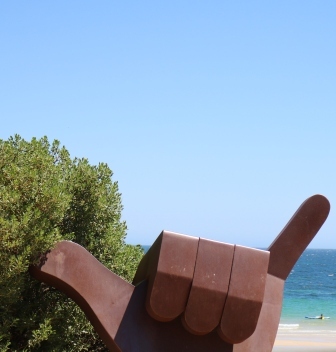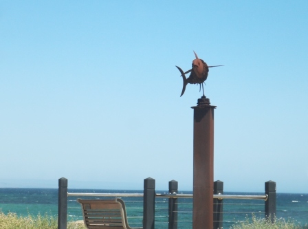 Further south along the foreshore you’ll find a ‘shaka’ hand gesture sculpture called ‘Hang Loose’ by Chris Murphy, Pelican sculptures by Ty Manning, a tuna sculpture by Flynn O’Malley and a figure doing a handstand.