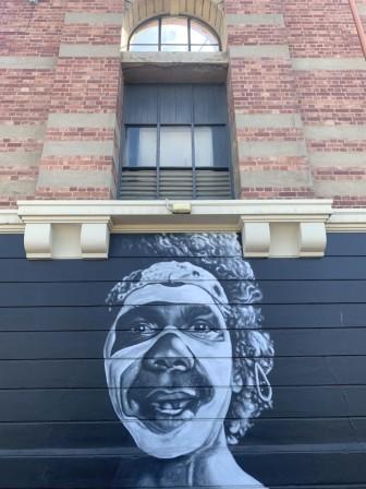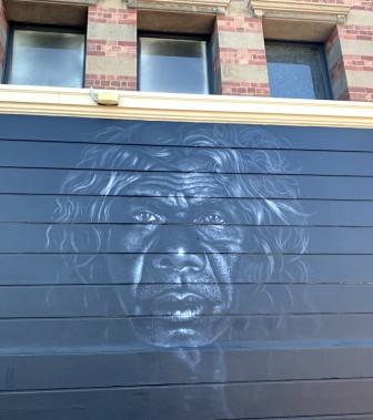 The mural along the side of the building depicts aboriginal actor, dancer, singer and painter David Gulpilil AM, and includes images of Gulpilil as a younger and older man as well as scenes from his film Walkabout.  The painting of the Gulpilil in his older years is particularly good and very photo realistic.