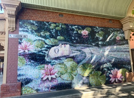 Another mural is by artist Jimmy C and depicts the Shakespearean character of Ophelia with inspiration from the Adelaide Botanic Garden’s sacred lotus.