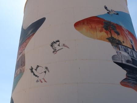 The two silos are painted on both sides and feature silhouetted faces of well known local identities and iconic Riverland images, with the common theme of flying pelicans across all of the silos linking the stories together.