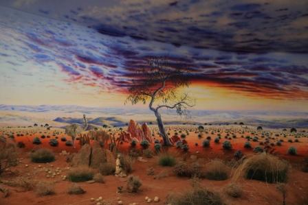 The painting created by local artist Peter Anderson (Ando) is incredible with mountain ranges, animals and different weather effects all in this massive scene. The experience is both terrific and corny in parts with some terrific realistic looking snakes and lizards, plants and skulls in the foreground landscape and then some pretty bad, garden statue type kangaroos and emus that just detract from the good. They could probably lose the garden statues to keep it more realistic in my opinion.