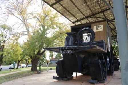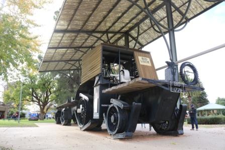 In 1920 it was used to clear trees and scrub in Red Cliffs to establish the largest soldier settlement in Australia. Her specifications (in old measures) are, 34 ft long, 11 ft wide, 18 ft high, total weight 45 tons, normal travelling speed 1 mph and it had a turning radius of 200 feet!