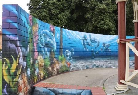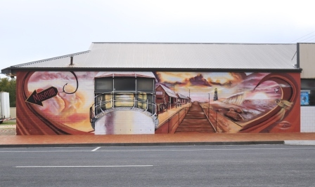 The RV park is next to a very tidy town park which has toilets, a playground and some terrific art including a wall surrounding the rotunda which was painted by Marciano Arents of Senman Creations, who also painted a mural on the wall of the local museum.