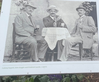 The sculpture sits in a small park and is the re-creation of a photograph taken in the early 1920s, which shows the three prominent businessmen sharing a table and a lager together.