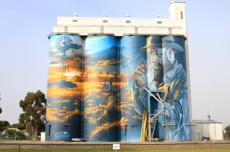The town is surrounded by farming land and the silo artwork depicts the pioneering farmers and local history. A windmill is a prominent part of the painting which references the challenges that farmers faced without any above ground surface water source. The low rainfall and dense coverage of Mallee trees meant hard work for the initial establishment of farms and with windmills popping up everywhere to access underground water, the town became known as ‘the land of the windmill’.