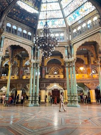 To enter the palace you have to remove your shoes, which are safely stored for you to collect afterwards, and you then enter through the elephant gate to the marriage pavilion. The octagonal painted pavilion has a stained glass ceiling which together with the mosaic tiled floor has a main theme of the peacock, hence the hall is also known as the Peacock Pavillion.