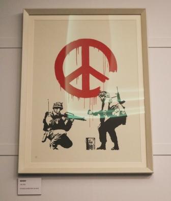 Another Banksy on show is Flower Thrower, a politically motivated image where a bandana masked man seemingly about to throw a missile, is instead about to launch a bouquet of flowers, symbolising an appeal to replace violence with peace. Similarly the artwork of two armed soldiers painting a graffiti peace sign has become a universal symbol of antiwar sentiment.