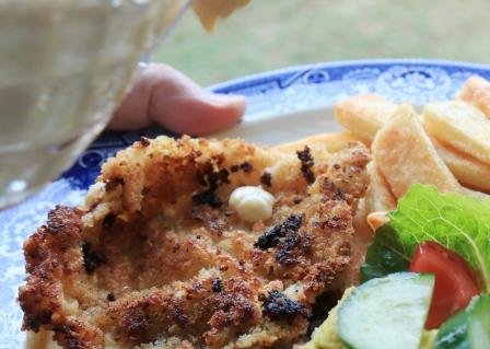 This is something that’s been popping up more and more on pub menus, so I’ve given it a go too. My version is crumbed with lemon and herb panko crumbs and I’ve paired it with a creamy garlic sauce.