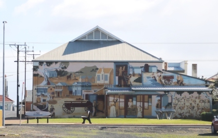 A little further along the foreshore a large mural covers one full side of the Community Hall, which is located one street back. The mural depicts local history scenes over its full 233 square metres, and was painted by local residents and regional artist Kathy Mabon.