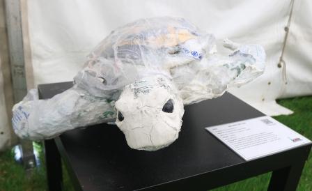 Others are statements about the impact of human overuse of plastics and the damage it’s doing to the natural world, including ‘Pie Perspective’ and ’20-500 50 – 100’ which refers to how long it takes for plastics to break down versus the expected lifespan of a green sea turtle, both created by Stephnie Robertson.