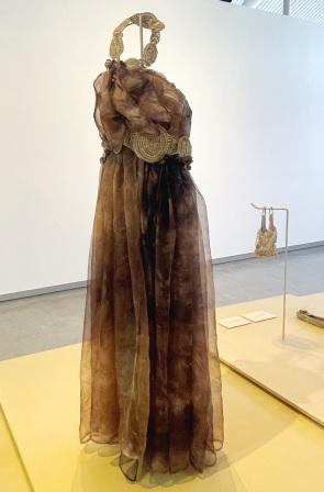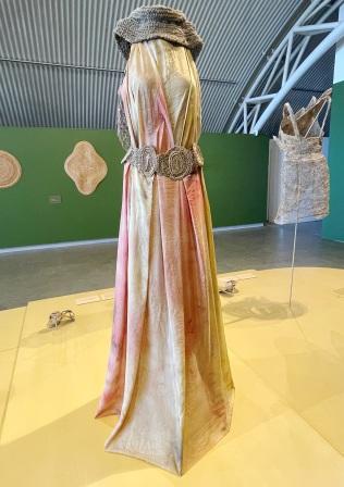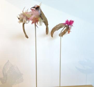 There are woven dresses and a couple of silk organza dresses which have been eco-dyed using various natural products including pomegranate fruit, calendula flowers, eucalyptus and nettle leaves and adorned with woven belts, necklaces and collars. There are even contemporary woven head pieces, fascinators and hats, some of which have dyed pelican feathers included in the details.