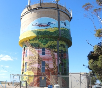 The salt lakes are such a feature of the area that even a water tower in Yorketown has had the street art treatment by artist Jasmine Crisp, and features amongst other local scenes, a pink lake.