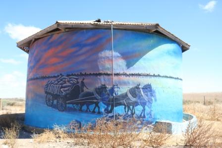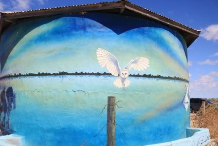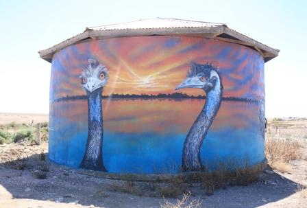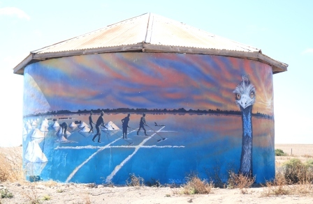 Along the trail you’ll also find this brightly painted water tank which depicts salt lake workers, emus and other scenes from the area. The artist, from Studio Surf, was also responsible for some of the murals in Warooka.